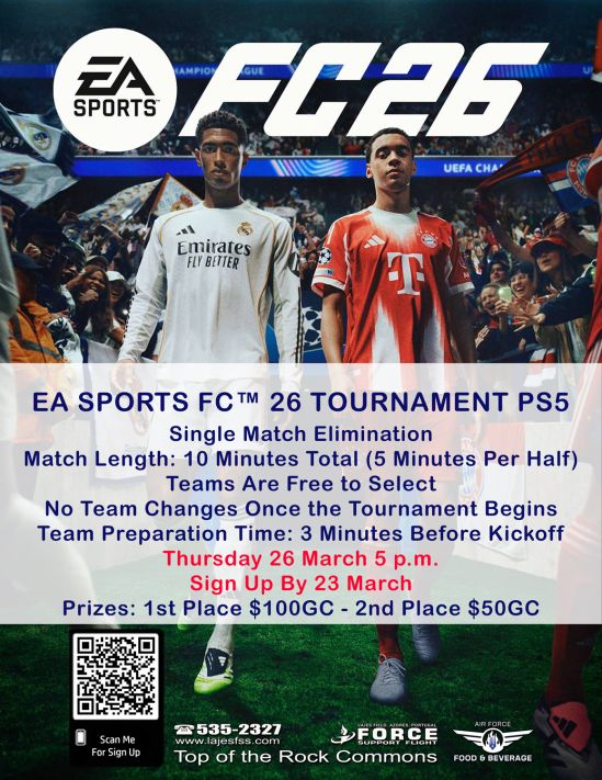 The EA Sports FC 26 Tournament is a single-elimination PS5 competition held on 26 March at 5 p.m. Players can choose any team, with 10-minute matches and no team changes once play begins. Sign-ups close 23 March, and prizes include $100 for first place and $50 for second. The event takes place at Top of the Rock Commons.
